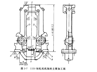 機架是軋鋼機主要零部件,為了保證正常軋制,為了保證必要的軋制精度及安裝調(diào)整的方便,對機架的機械加工有嚴格的要求。下面以1150初軋機機架為例,簡單地介紹機架加工方面的技術要求(見圖3-7)