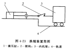 換輥裝置見圖如圖4-23所示,主要由液壓缸1,鎖鉤2,內(nèi)機架3及輥道4組成。