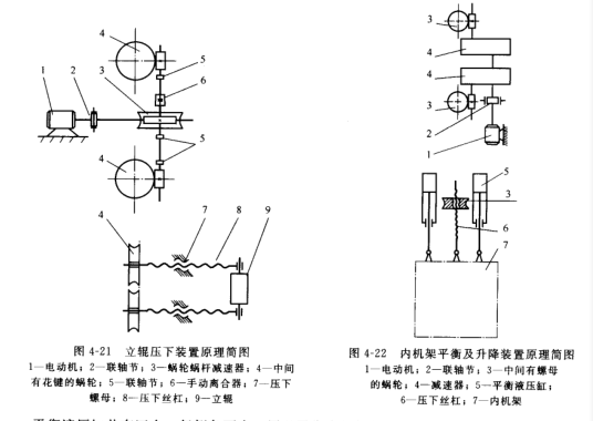 立棍壓下裝置原理如圖4-21所示。主要由電動機1,聯(lián)軸器2,兩級洛倫桿減3和4,壓下螺母7,壓下絲杠8及手動離合器6等部件組成。壓下裝置工作原理與其他軋機壓下裝置基本相同,有兩套壓下裝置,分別驅(qū)動2個立棍。